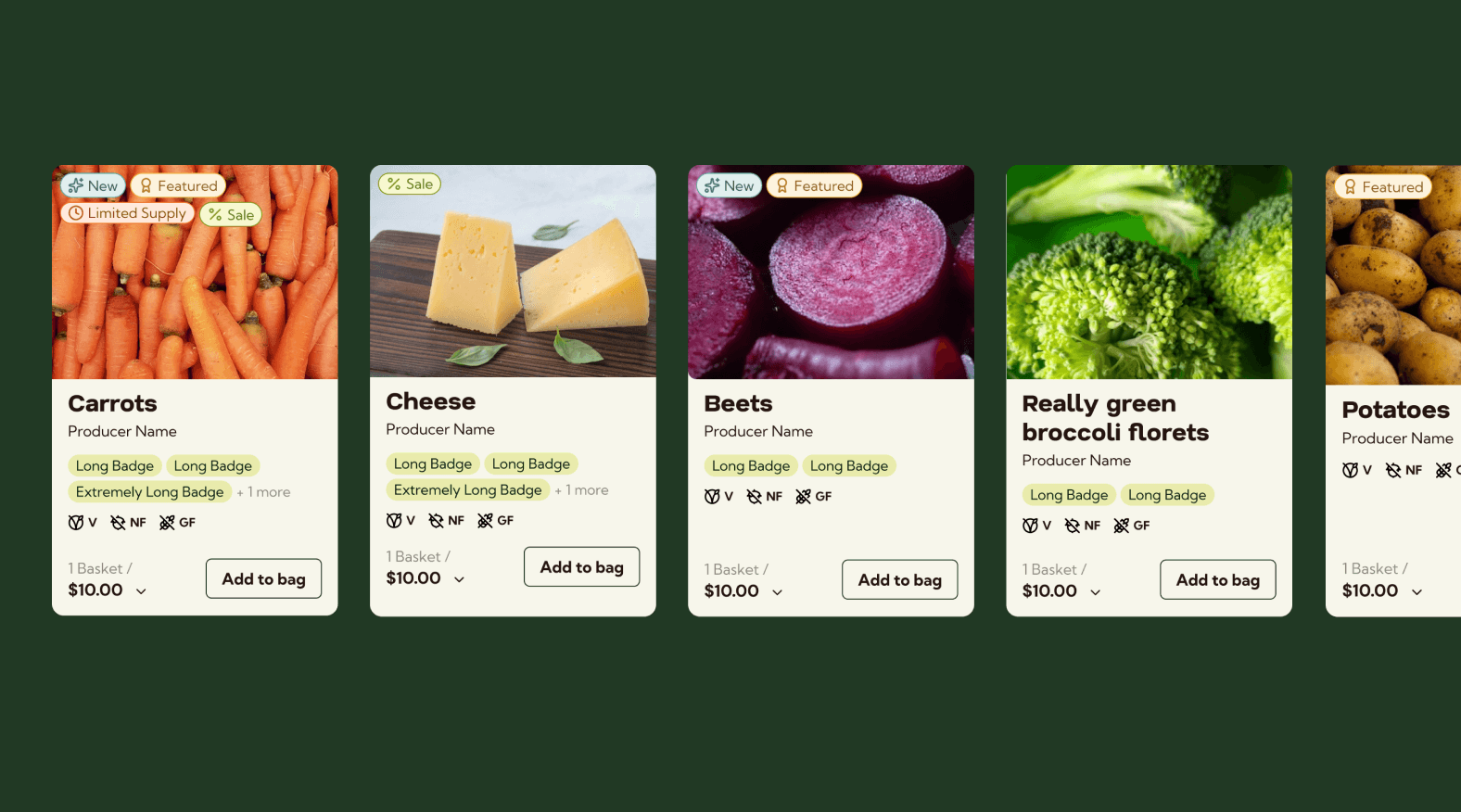 The product cards were designed to house numerous types of information such as: product name, producer name, promotional tags, dietary tags, product tags, and variants. The need to cleanly organize this information and establish good heirarchy was essential