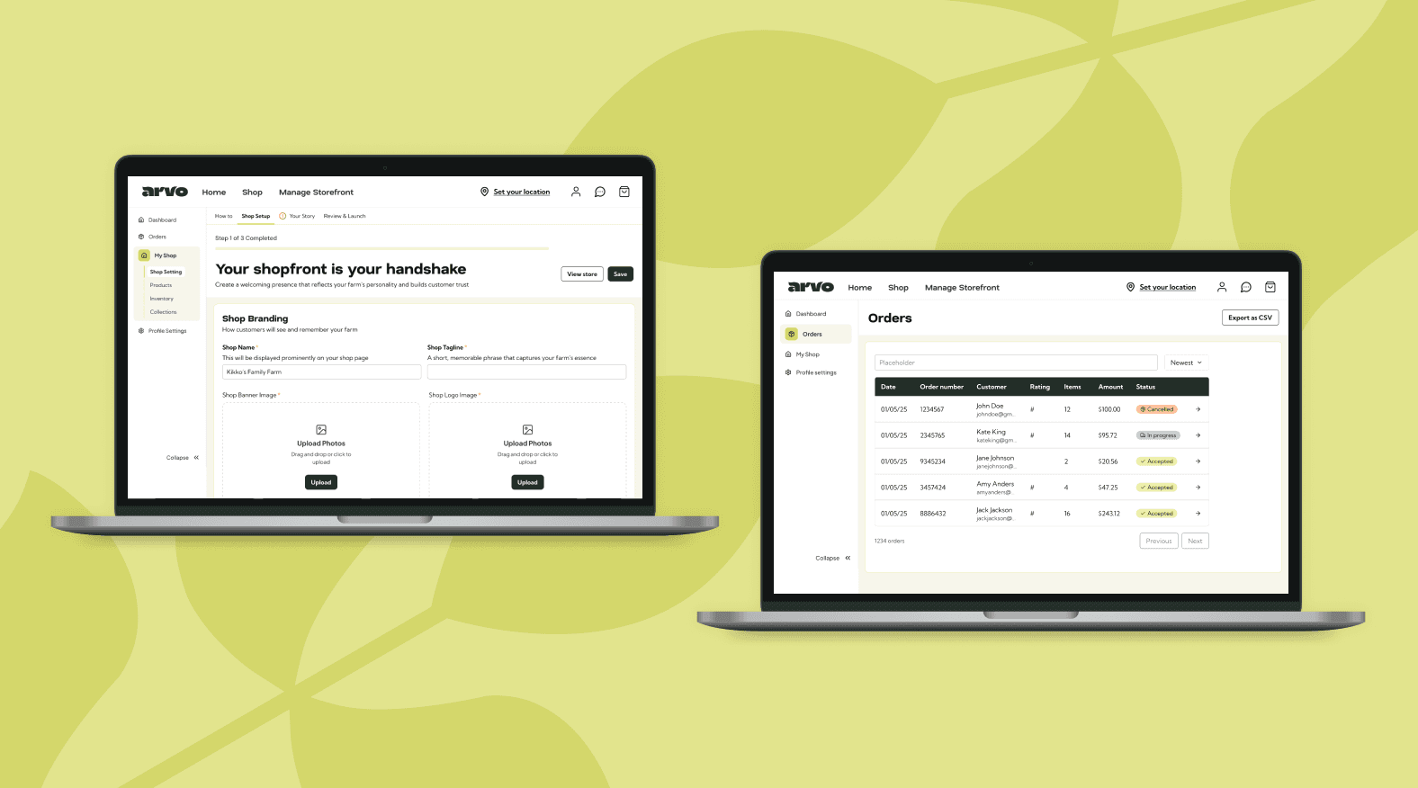 Because ARVO is a marketplace for various producers, a flow was buillt to guide the producers through the storefront setup process. These screens were designed to be frinctionless and allow the producers to quickly and easily set up their storefront so that they could get their products in front of consumers