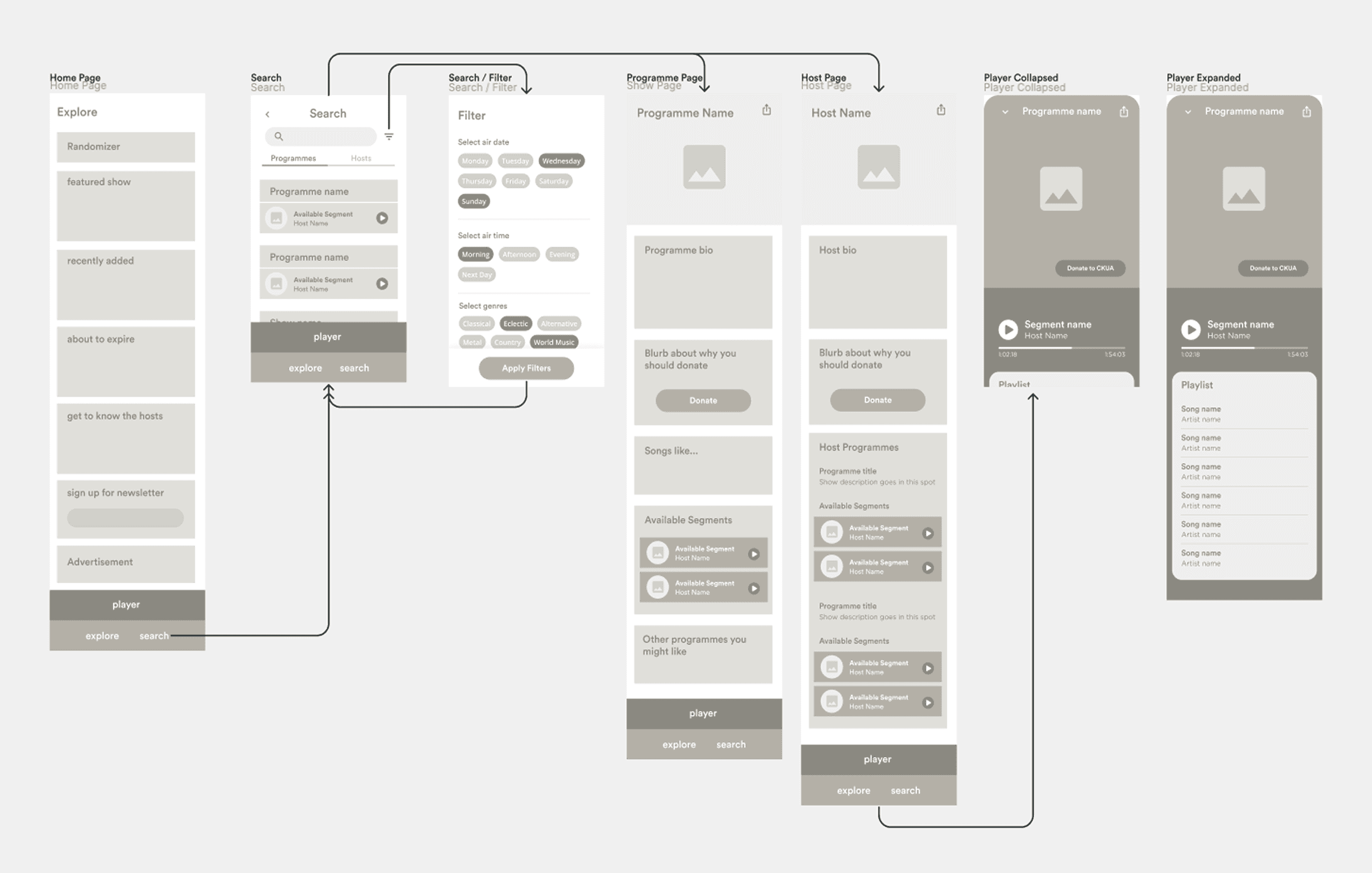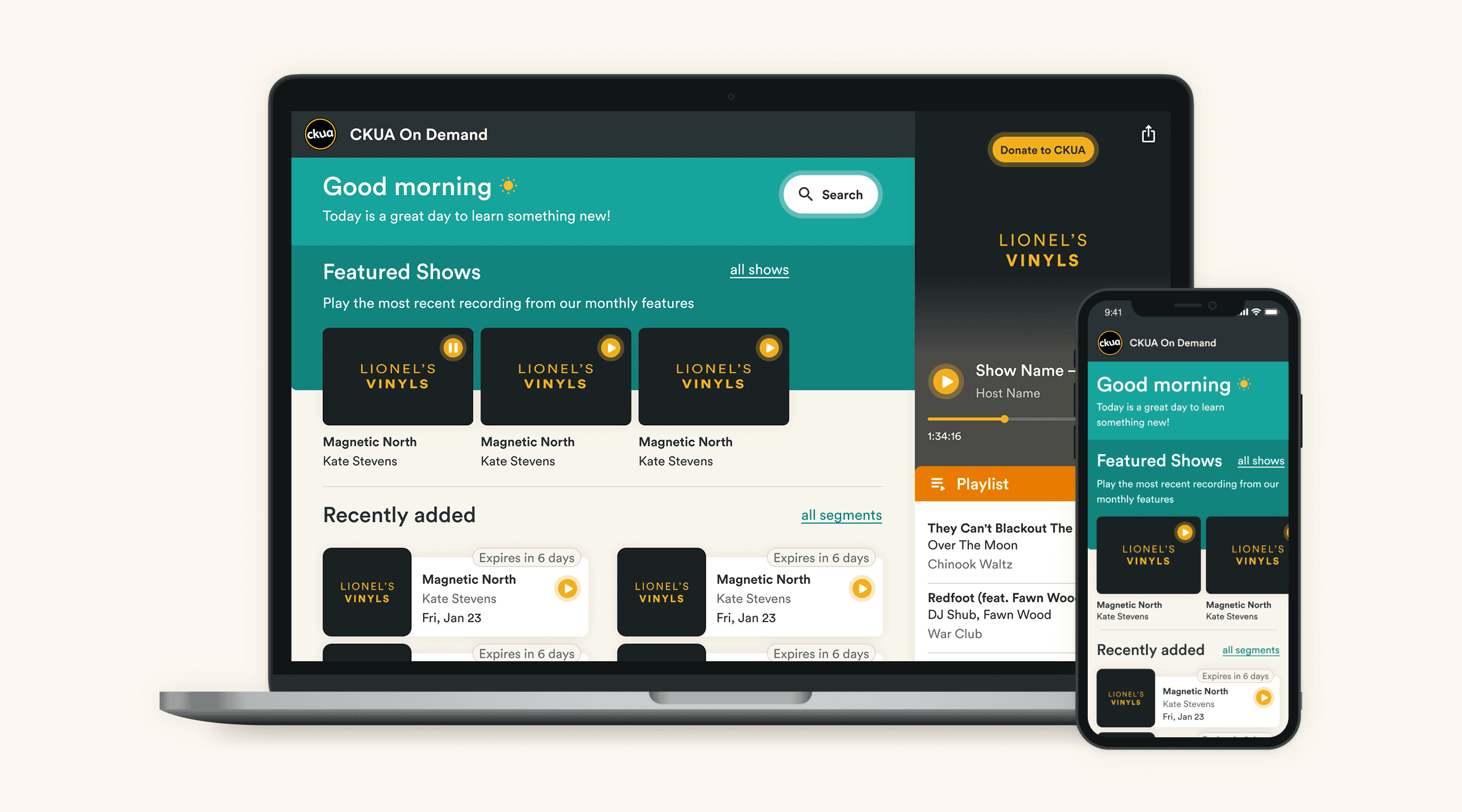 An on-demand platform where users could access any show from the past seven days on any device. The app should be built to minimize staff workload, with automated content removal after seven days, with clear availability indicators due to legal restrictions. As well as have an admin feature that allows the CKUA staff to make copy and content changes without needing a developer.