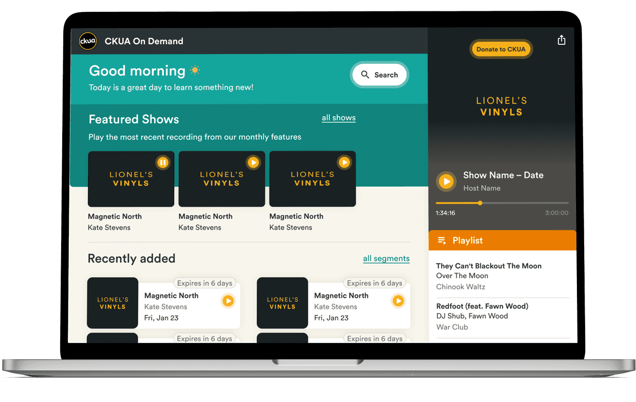 CKUA has some of the most dedicated listeners of any radio station in Alberta—largely because of their big roster of show hosts and their wide breadth of music genres. Listeners often become long term fans, but if they move out of Alberta (which many have over the last several decades), they might not be able to listen to their favourite show, since online streaming is only available live and in real-time. CKUA wanted to solve this problem by creating an On-Demand listening platform for their users.